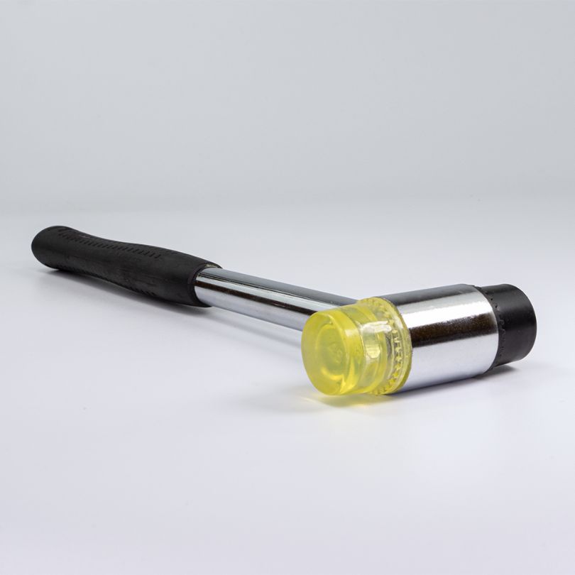 Ausführung mit schlagfesten Köpfen, eine Seite Spezialkunststoff die zweite Seite aus Gummi, Mittelteil und Griff Stahl