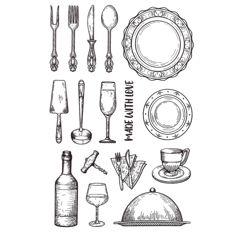 Besteck, Speiseteller, Gläser, Tassen Weinflasche, Kelle, Schöpfer, Korkenzieher usw.