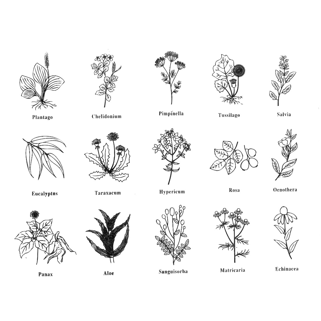 15 Heilpflanzen: Wegerich, Schöllkraut, Pimpinelle, Huflatich, Salbei, Eukalyptus, Löwenzahn, Johanniskraut, Rose, Nachtkerze, Ginseng, Aloe, Wiesenknopf, Kamille, Sonnenhut